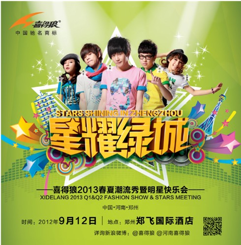 据悉,作为国内知名的潮流休闲品牌之一,“喜得狼”将于2012年9月12日携手“快男”、“超女”在河南郑州激情演绎“喜得狼2013春夏潮流秀暨明星快乐会”,为这座具有“绿城”、“商都”之称的历史文化名城,增添一道独特的星光。届时,喜得狼品牌旗下代言人李炜、刘心、武艺、艾梦萌、阳蕾等明星将联袂登台献艺。相信当天晚上,明星们热力四射的音乐舞蹈以及模特风格百变的潮流秀,必将为广大经销商伙伴以及众多为品牌与明星魅力所吸引的粉丝们,带来一场前所未有的快乐盛会。