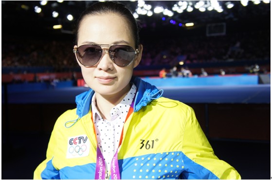 丝路夸张的大镜框,女生佩戴上,就更多了几分英气勃发之势。隐约可以看到的奥运赛场背景,中国加油!