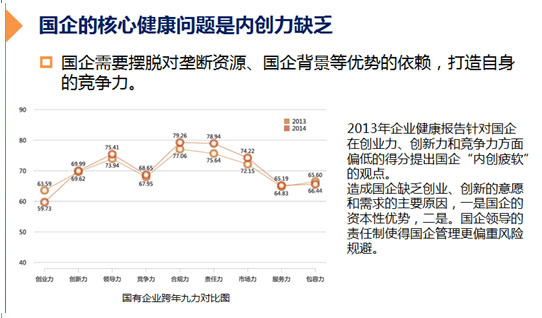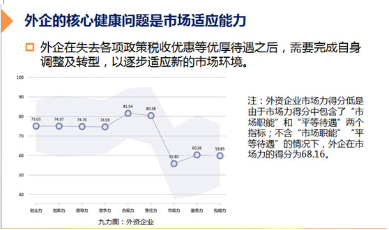 他清晰指出,中国企业的发展状况任重道远,总体得分仅达及格线60分以上。民企、国企、外企分别在市场竞争中暴露出不同的问题:民企缺乏自律、国企内创疲软、外企市场适应能力不够。