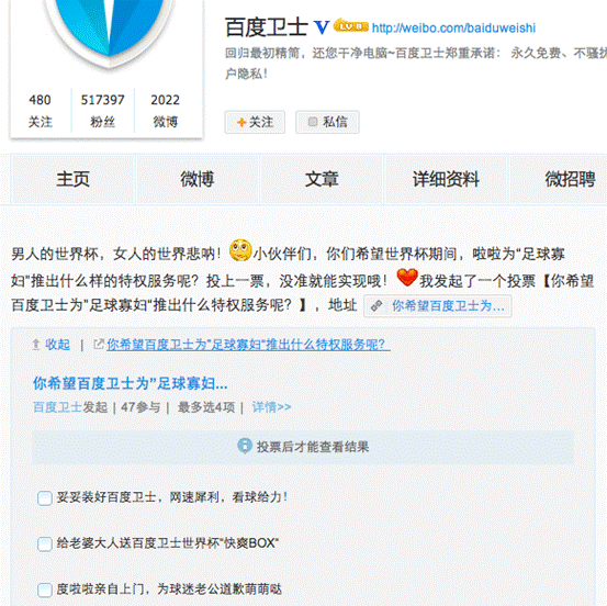 就在“睡衣女”事件被网络疯传之时,百度卫士官方微博及时推出“拯救世界杯寡妇”投票活动,票选拯救最佳方案。其中选项既有无厘头的“搞定国际足联,下届世界杯在中国办”、也有具有诚意的“度啦啦亲自上门,为球迷老公道歉”,更有“装好百度卫士视频加速版”、“给老婆送百度卫士世界杯快爽BOX”等靠谱解决办法。据了解,世界杯期间百度卫士联合中国电信合作推出了“百度卫士视频加速版”,软件通过可以为用户免费提升10倍网速,成为众多男球迷深夜网络看球的法宝。