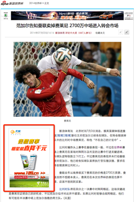 和中国移动采取多种方式露出品牌、广泛覆盖大多数用户的策略不同,中国电信则瞄准了比较关注世界杯资讯内容的读者人群,采取了结合新闻内容的纵深营销策略。在读者点击其感兴趣的新闻标题之后,就进入新闻正文页面,每条新闻的左侧的显著位置,都会展示所嵌入的中国电信“天翼神机妙算,竞猜比赛结果购机降千元”专题。