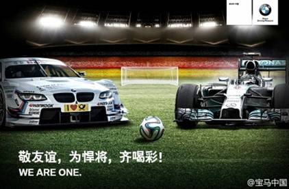 点评:为了国家化“敌”为友,品牌高度就是这样提升的!长期雄踞中国高档车市场的德系三强,奥迪、宝马和奔驰,用各自的方式为祖国球队助威,面对这一破天荒的举动,网友们惊呼“是激情还是基情”,同类竞品之间的互动营销,实属罕见。