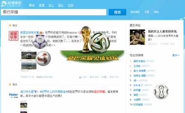 Allin or nothing成皇或败寇,阿迪达斯的这句slogen,中文译义多了一抹骄傲的英雄主义色彩。阿迪达斯一直以来都是世界杯官方用球提供商,在其营销动作中,这一点不断重复体现。阿迪达斯在微博上建立了#成皇或败寇#话题页,并且植入每场微博热门话题榜推荐中;在世界杯开赛前三天,用户只要从PC端新浪微博搜索“阿迪达斯”或者“桑巴荣耀”关键词,就会在首页降下阿迪达斯为历届世界杯制作的比赛用球。利用世界杯期间微博话题的热度以及讨巧的视觉展示,实现品牌营销。