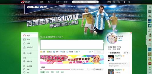 世界杯期间,不管是资深球迷还是资深伪球迷,心中都有个最佳球员。吉列利用大家追星心态,在新浪制作的球星主页,选择了梅西页面。网友只要在梅西主页参与互动,发布微博支持梅西、支持阿根廷等等,都会获得在新浪世界杯的主页面一键换微博皮肤,拥有个性的新浪专题世界杯微博定制页面。