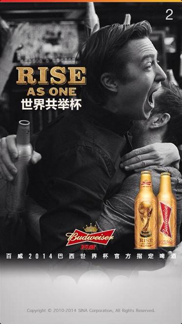 抢滩移动端重在抢入口。世界杯期间,百威啤酒选择了新浪新闻客户端和新浪体育客户端两大APP,并占领了其开机报头广告。移动端屏幕空间有限,开机报头广告因其无可比拟的展示和Reach(触达)效果,无疑是其中最好的移动互联网展示广告产品。百威通过开机报头广告强势占据移动端入口,充分传播品牌信息。除了线上营销外,作为历届世界杯官方赞助商,百威在线下推出世界杯专版的产品、世界杯主题大篷车线下体验活动等,实现全方位立体营销推广。