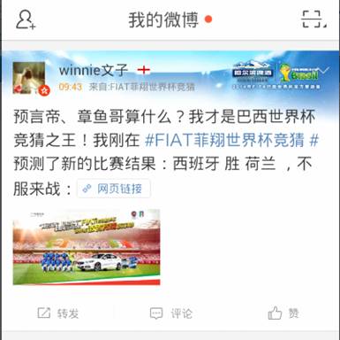 世界杯期间微博的活跃度令人瞠目,哈尔滨啤酒也选择了微博作为创意营销实施阵地,做了一个很好玩的页面活动。用户在微博移动客户端发布带有“巴西世界杯”的微博,就会显示带有哈啤品牌定制背景(微博关键词彩蛋广告),拉近品牌和消费者的关系。世界杯开赛当天微博彩蛋就被触发3700万次,而且触发行为全部都是微博主动行为,转发和评论是无效的。有趣好玩,才能实现社交媒体上的有效传播。