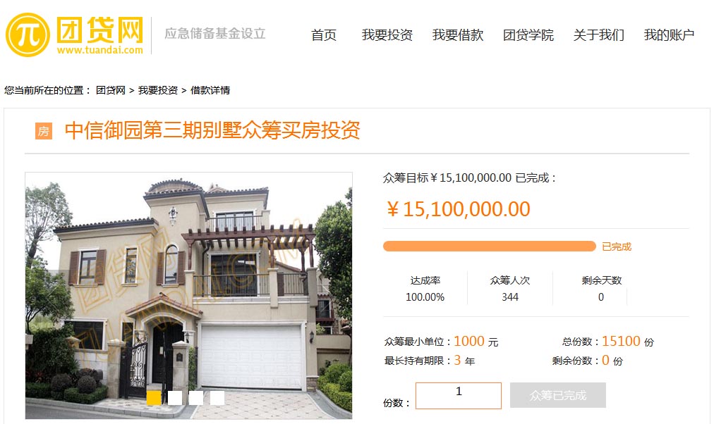记者调查发现,第三期推出的依然是中信御园项目中的一套别墅,中信御园位于东莞的中心地带,属于当地的高端房产项目,目前搜 房网上报价为3.5万元/平方米,团贷网以7折多的价格团购了本项目的18套别墅。目前第一期已经以1600万元售出,溢价109万元,折算年化收益率近40%。另外,第二期的信息显示已有买家愿意溢价购买该房产,前两期的成功,让投资者对房宝宝这种地产众筹的模式更增强了信心。