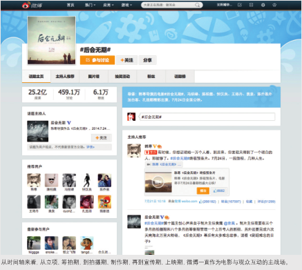 信息发布,只是作为微博助力电影营销的基本功能,随着与微博合作的电影越来越多,微博也正在根据平台的升级,不断尝试深度渗透电影运营的机理之中,如搭配影片在微博账号、话题活动上进行的支持、票务售卖的接入、音乐视频的引进、明星的互动支持等等。