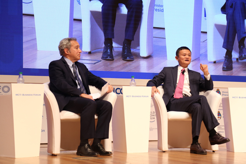 当地时间12月12日上午,在阿根廷举行的世贸组织第十一次部长级会议商业论坛上,阿里巴巴董事局主席马云与世界经济论坛董事会成员理查德·扎曼斯展开一场主题为“未来贸易“的对话。