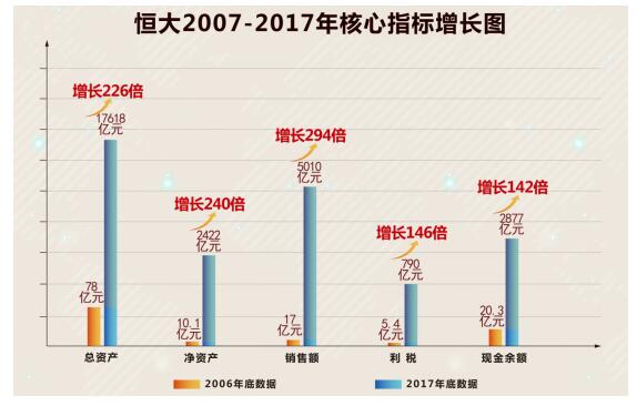 接下来的2007年到2017年,是公司实现大跨越、大发展的十一年。我们统计了一下恒大在这十一年的主要经济指标增长情况: