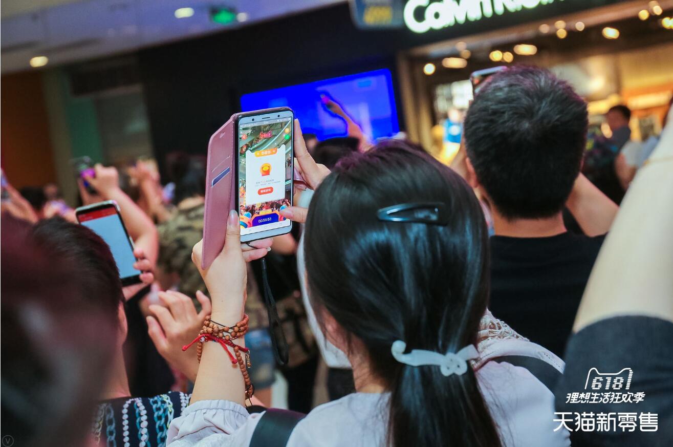 在上海中山公园的龙之梦、杭州城西银泰等商圈里,天猫618的活动吸引了全城市民参与。顾客纷纷举起手机打开天猫APP参与618活动。天猫方面的数据显示,截至6月16日12点,天猫618分布在全国各地的71家新零售快闪店就吸引了近660万人次参与互动。