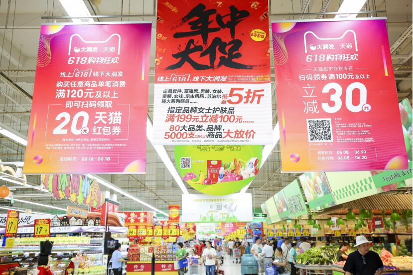 各大商场和大润发超市则下起了“红包雨”。大润发与天猫超市线上线下联动,大润发门店内的天猫超市好货专区,扫码即可领取满100元立减30元红包;在大润发门店单笔购物满120元,可以获得20元天猫红包。