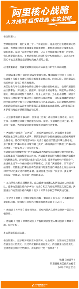 2018年11月26日,阿里巴巴集团CEO张勇在面向全体员工的一封公开信中,宣布了阿里巴巴最新的组织升级调整:阿里云升级阿里云智能;加强技术、智能互联网的投入和建设;天猫自我升级和裂变为大天猫;为未来5年到10年的发展奠定组织基础和充实领导力量,全力打造阿里商业操作系统。