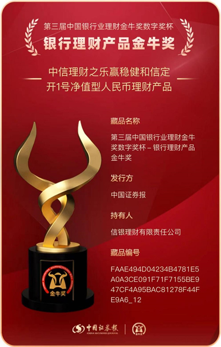 11月23日,2022银行保险业财富管理论坛暨第三届银行业理财金牛奖颁奖典礼在北京举行,信银理财旗下“中信理财之乐赢稳健和信定开1号净值型”产品凭借长期稳健的产品综合实力,荣膺“银行理财产品金牛奖”。