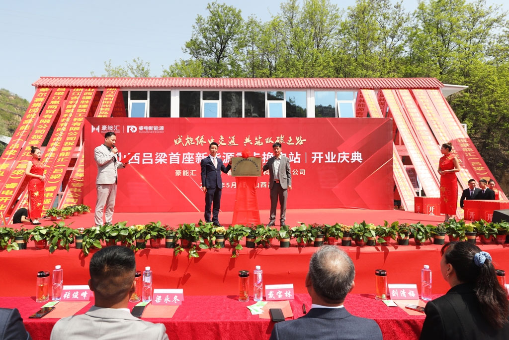 随后进行的是揭牌仪式,在现场嘉宾的翘首期盼下,豪能汇新能源副总经理包瑞与睿电新能源副总经理刘勇缓缓拉下鲜艳的红绸布,“豪能汇(吕梁)睿电新能源科技有限公司”正式揭牌。