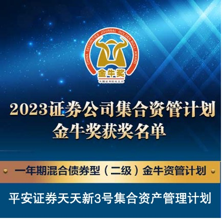 10月25日,由中国证券报主办的" AI驱动 数智赋能 共建券业新生态——2023证券业金牛奖颁奖典礼暨数字金融创新发展大会"在苏州隆重召开,活动同步举办了2023证券公司集合资产管理计划金牛奖颁奖典礼。凭借在资管业务上的优异表现,平安证券荣获“2023年证券公司集合资产管理计划金牛奖(平安证券天天新3号集合资产管理计划)”。