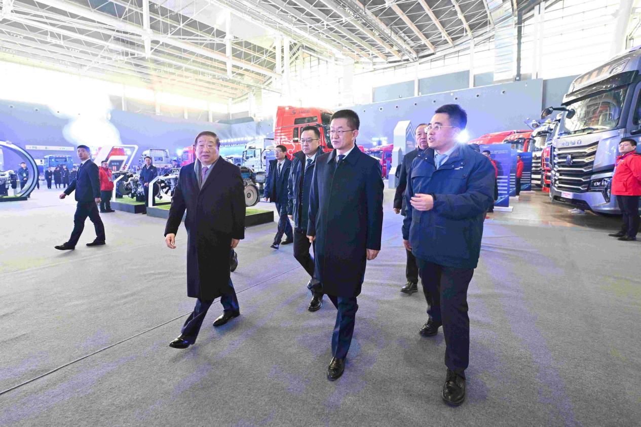 大会开始前,谭旭光还陪同马宇骏到中国重汽新科技产品展示会巡展。展区78辆整车产品、50件零部件在冬日里闪耀着希望的光芒。新能源、清洁能源、高热效率、专用车、轻型车和新发布产品等商用车整车让广大合作伙伴流连忘返;发动机、变速箱、车桥、动力链、智慧座舱、智能动力域底盘等总成、零部件,全系列、全场景、一站式释放着中国重汽的全新黑科技,在冰封大地的北国孕育出生机一片。