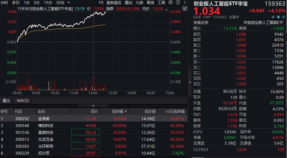 算力硬件股20CM涨停潮!创业板人工智能ETF华宝(159363)暴力上涨4%,实时涨幅、成交额、换手率领跑同类