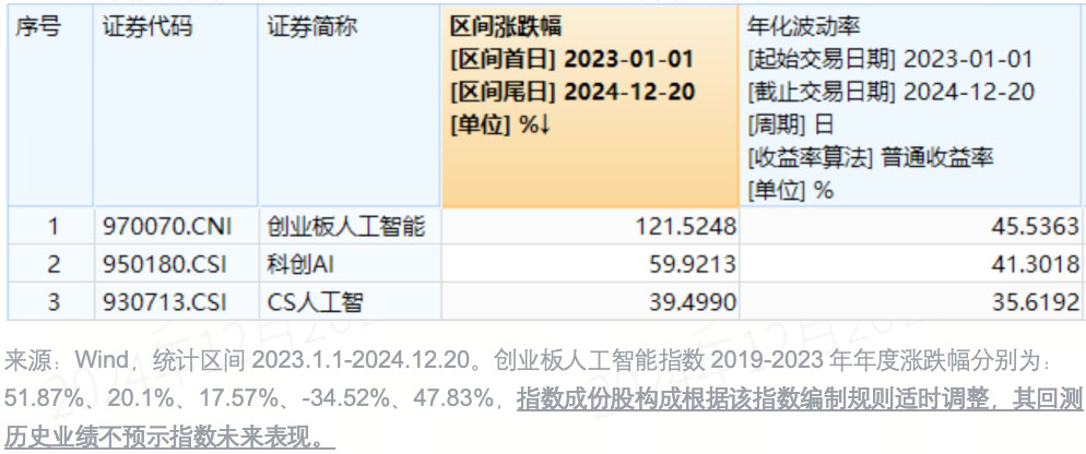 作为2025年最主要投资方向之一,人工智能有望继续作为市场主线,引领跨年行情,在指数或者ETF回调时可积极关注。从同类AI主题指数表现来看,创业板人工智能指数中长期业绩更优。数据显示,截至2024.12.20,创业板人工智能指数自2023年以来累计涨幅超121%,大幅跑赢中证人工智能、科创AI等同类主题指数!