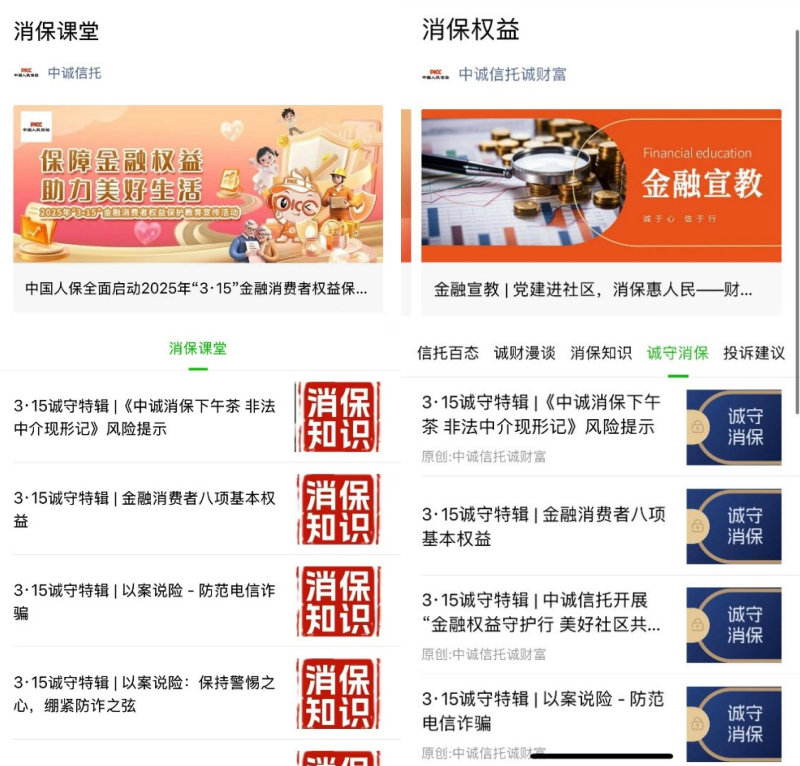 为进一步普及金融知识,让金融教育触手可及,中诚信托依托官网、微信公众号、视频号及App等新媒体平台,推出线上“金融云课堂”,设置“3·15”诚守特辑消保专栏,连续发布系列原创文章、科普短视频等,内容涵盖个人信息保护、非法集资识别、电信诈骗防范等热点话题。此外,公司还举办了线上消保知识竞赛活动,帮助金融消费者在竞技答题中增强金融安全意识。由金融专家及资深从业者组成的宣教小组结合真实案例,以图文并茂、通俗易懂的形式解析金融知识,并通过调研问卷精准捕捉客户需求,不断优化公司消保服务短板。活动期间,线上内容阅读量超200万人次,成为公众触手可及的“金融云课堂”。