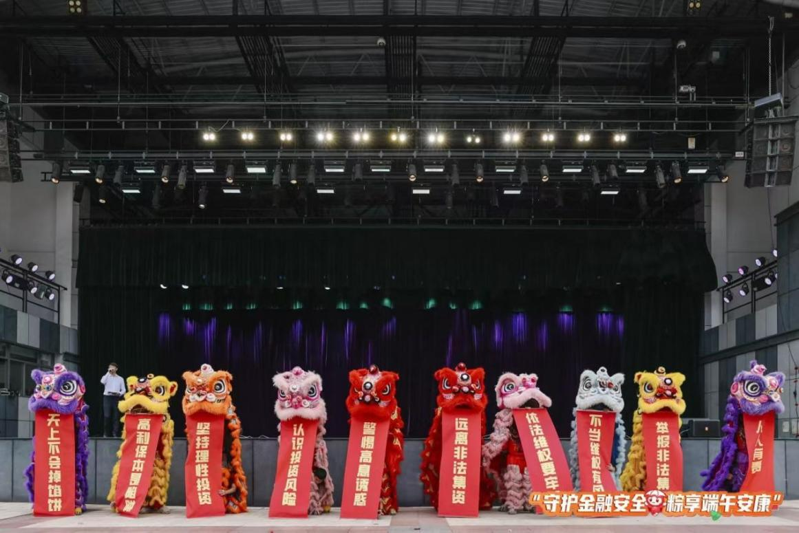 在激昂的锣鼓声中,金红相间的醒狮以矫健腾跃之姿拉开活动帷幕。点睛环节将仪式推向首个高潮——嘉宾手持朱砂笔为醒狮点睛,随着狮目被赋予灵动的神采,“识别非法集资的火眼金睛”这一寓意跃然而出。当雄狮吐出“守护金融安全 粽享端午安康”的对联时,现场爆发出热烈掌声。醒狮巡游环节,祥狮们踏着鼓点韵律穿梭于观众席间,居民王阿姨轻抚狮头感慨:“这灵狮既送来端午祥瑞,更教会我们擦亮防骗慧眼,比发传单生动多了!”