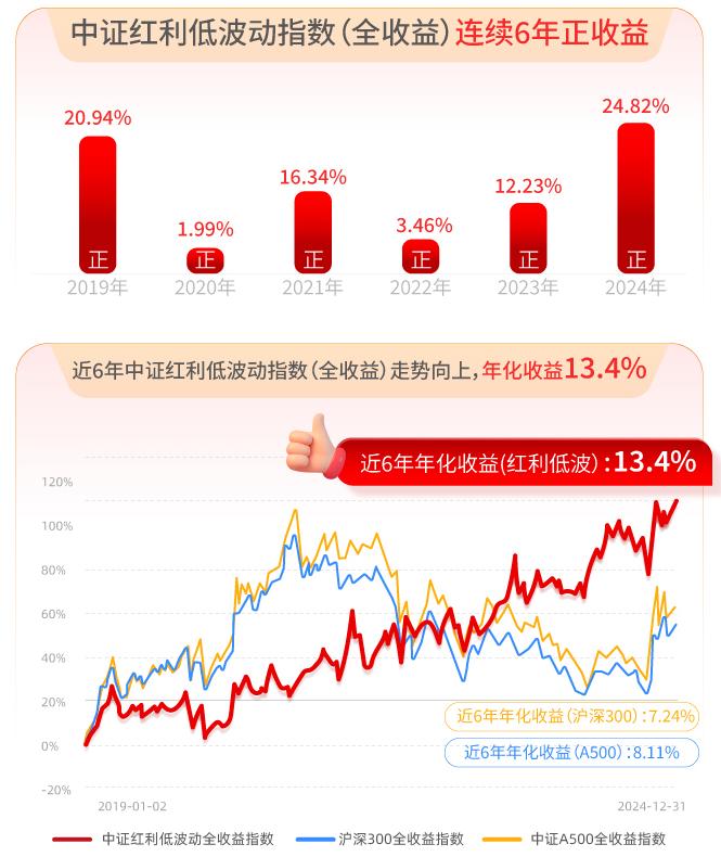数据来源:Wind,兴银基金整理,中证红利低波动指数(全收益)是指H20269.CSI、沪深300指数(全收益)是指H00300.CSI、中证A500指数(全收益)是指000510CNY010.CSI。时间区间为2019/1/1-2024/12/31,指数的过往收益不代表本产品未来的表现,也不作为未来收益的保证。基金有风险,投资需谨慎。