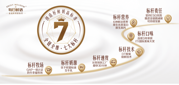 如果说具有流量密码的大IP和有竞争力的产品矩阵是每日鲜语打开市场的锋利之刃,那么不断升级的品质标准则是品牌持续立于潮头的根基。鲜奶竞争的核心,归根结底是品质的竞争。每日鲜语自创立之初便确立了“高端鲜奶新标杆”的品牌定位,并在2025年正式升维“创造好鲜奶高标准 全链全维7大标杆”的品牌价值体系,从牧场到奶源,从技术到营养,从口味到责任,为行业树立起全方位的质量标准。
