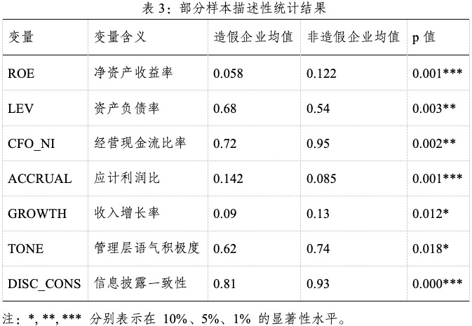 为验证样本数据的合理性及造假企业特征差异,本研究对主要财务指标和文本语义变量进行了描述性统计。分析维度涵盖盈利能力、偿债能力、现金流质量、盈余操纵倾向及文本披露特征等。其中财务指标包括净资产收益率(ROE)、资产负债率(LEV)、经营现金流比率(CFO_NI)、应计利润比(ACCRUAL)和收入增长率(GROWTH);文本变量包括管理层语气积极度(TONE)与信息披露一致性(DISC_CONS)。为检验造假与非造假企业差异的显著性,采用独立样本t检验,并在 1%、5%、10% 显著性水平下判断均值差异。