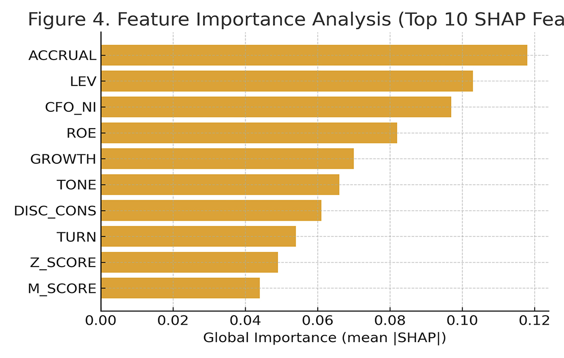 为增强模型的可解释性,接下来采用SHAP(SHapley Additive exPlanations)方法分析输入特征的重要性。图2展示了前10个关键特征的排序结果。可以看到,应计利润比(ACCRUAL)、资产负债率(LEV)和经营现金流比率(CFO_NI)的平均 SHAP 值最高,说明盈余操纵程度与杠杆水平对企业造假的预测影响最为显著。股东权益回报率(ROE)和增长率(GROWTH)亦具有较强解释力,表明盈利能力与扩张速度与舞弊动机密切相关。同时,信息披露一致性(DISC_CONS)和语气积极度(TONE)的重要性较高,说明管理层语言特征能够有效反映潜在风险。此外,资产周转率(TURN)、财务困境指数(Z_SCORE)与盈余操纵指数(M_SCORE)等指标也对预测结果有一定贡献,分别对应运营效率、财务稳健性与盈余管理风险,对识别高舞弊概率企业具有辅助作用。