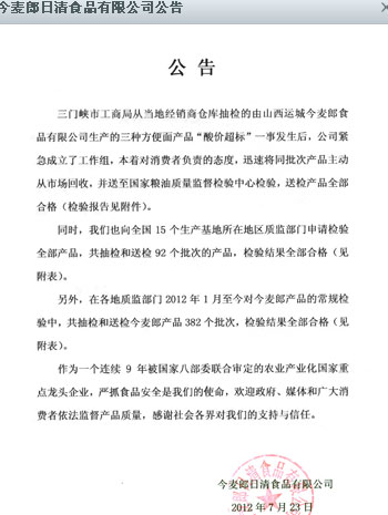 7月23日,今麦郎在其官网上发布公告称在三门峡市工商市局抽检今麦郎三种方便面酸价超标之后,公司紧急成立了工作组,将同批次产品从市场上收回并送至国家粮油质量监督检验中心检验,检验产品全部合格。