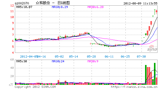 自2012年7月30日以来的短短八个交易日,众和股份七度涨停,没有涨停的那一天也大涨6.89%,累计涨幅高达108%,可谓当之无愧的A股第一妖股。