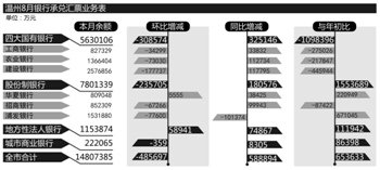 记者得到的一份当地银行承兑汇票数据报表显示,进入8月份以来,该区域的票据业务量大幅回落。除温州银行和农村合作机构两家地方性法人机构依然保持增长外,国有大行、股份制银行、城市商业银行均总体负增长。截至8月份,温州全市银行承兑汇票业务总量近1481亿,环比减少49亿。