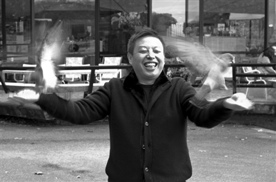 熔盛重工路演期间,张志熔喂食鸽子。邓辉 摄