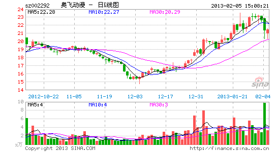 2013年1月31日,由奥飞动漫制作的《巴啦啦小魔仙》登陆全国各大院线,但是当日公司股价并无上佳表现,奥飞动漫在小幅高开后即震荡向下,盘中最大跌幅一度超过3%,截至当日收盘,奥飞动漫微涨0.65%,收于23.12元。