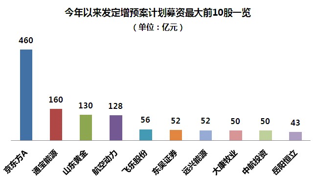 从已经公布预案的82家公司预计募资金额来看,胃口最大的当属京东方A ,该公司昨日晚间公布拟拟发行股票95亿股-224亿股,募集资金净额不超过460亿元,成为今年最大的融资额。而市场也用股价表现了其不满,京东方A今日盘中几近跌停。另外有三家公司计划再融资百亿元以上,分别为通宝能源、山东黄金、航空动力。通宝能源今年3月末复牌后公告称,拟募资160亿元购买股权资产和筹集配套资金,该公司股价自复牌以来小幅上涨后快速回落,截至目前较复牌前下跌超20%。山东黄金自7月复牌以来股价下跌三成左右,公司6月末公布重组方案,拟投入百亿收购黄金资产和筹集配套资金,而该公司也是目前为止折价最大的公司。