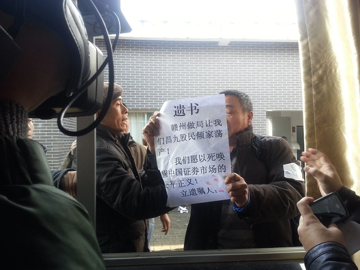 中证网讯 (郭力方 钟志敏 赣州报道)12月19日上午,昌九生化在赣州市章贡区五龙客家风情园(龙庆围)多功能厅召开媒体说明会。中国证券报·中证网记者在现场看到一位满头银发的股民满含泪水向记者展示其写的“遗书”。