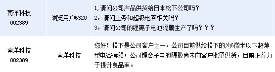 南洋科技(002389)周四上午在全景网互动平台上表示,日本松下是公司客户之一,公司目前供给松下6微米以下超薄型电容薄膜。