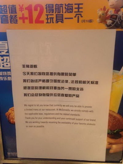 25日,北京部分24小时麦当劳餐厅贴出告示暂停营业,北京地坛附近的东宝餐厅,从晚上22点开始暂停营业,店内汉堡只有麦香鱼。阜成门附近一家餐厅称因设备维护,将于25日23时——26日7时暂停营业。记者通过麦当劳订餐电话咨询,客服称主食和套餐只有麦香鱼,不清楚何时恢复正常订餐。