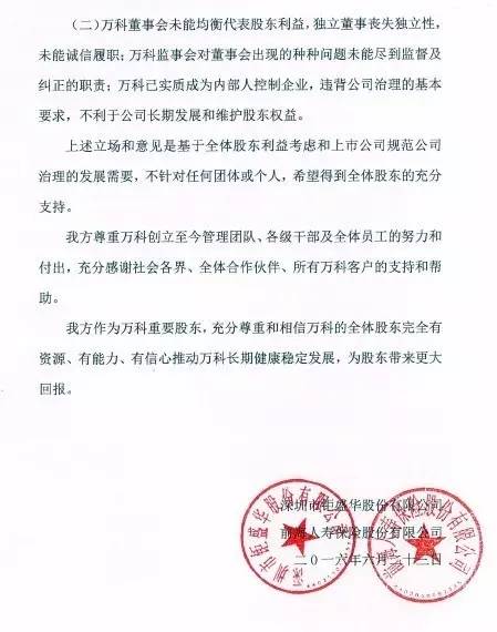 两家公司称,万科董事会未能均衡代表股东利益,独立董事丧失独立性,未能诚信履职;万科监事会对董事会出现的种种问题未能尽到监督及纠正的职责;万科已实质成为内部人控制的企业,违背公司治理的基本要求,不利于公司长期发展和维护股东权益。