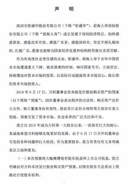 深圳市钜盛华股份有限公司、前海人寿保险股份有限公司发布公告称,明确反对万科发行股份购买资产预案,后续在股东大会表决上将据此行使股东权利。