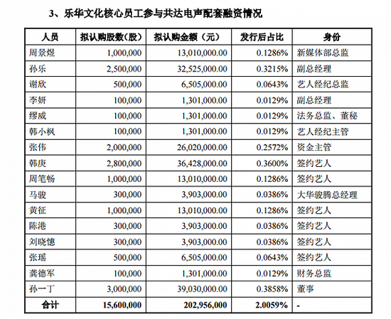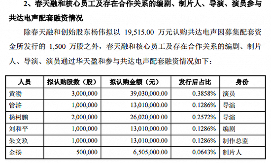 同时,共达电声的9名定增对象中,华天盈和最为引人注目,其合伙人均为春天融和、乐华文化、共达电声的核心员工及存在合作关系的编剧、制片人、导演、演员,实质为重组后共达电声的员工持股平台。在共达电声所公布的配套融资计划中,韩庚、周笔畅等明星也赫然在列。