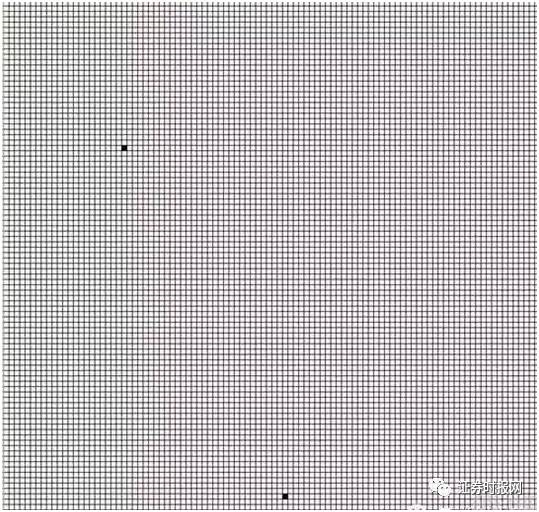 这是一张100*100的图,图中一万个方格,两个方格填充黑色,设想一下,假如你申购10个号,就是让你拿10枚针随手往上一扔(注意是随手一扔,并不允许你瞄准其中任何一个黑格),扎中其中任何一个黑格即为中签, 扎中的概率有多大?你现在扔了几次?