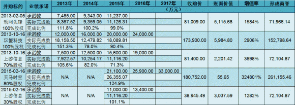 但是大幅扩张带来的危险接踵而至,首当其冲的就是商誉规模。界面新闻翻阅了掌趣科技2013年以来的并购案例,共同的特征就是高增值率以及高额的业绩对赌。以2013年收购的动网先锋为例。2013年收购时账面价值为5115万元,收购价高达8.1亿元,增值率达到了15.84倍。其承诺2013-2015年的业绩分别为7485万元、9343万元、11237万元。这份收购也直接形成了当年7.1亿元的商誉。此后掌趣科技又通过收购玩蟹科技、上游信息、天马时空分别形成了15.2亿元、7.2亿元以及26.1亿元的商誉。截止2016年的三季报,掌趣科技的商誉总额高达56亿元,占总资产比例54%,占净资产比例68%。