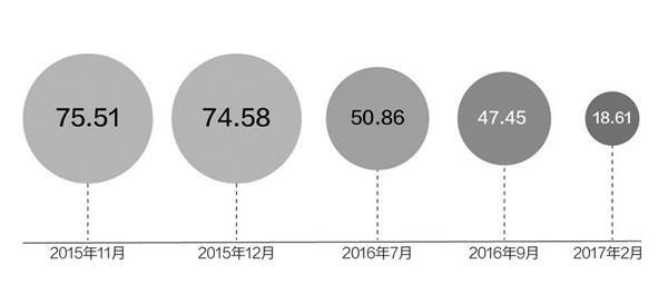 《每日经济新闻》记者梳理公告发现,2015年11月18日,银河生物首度发布2015年度非公开股票预案,拟非公开发行募集资金总额不超过人民币75.51亿元。此后,该定增方案历经董事会4次审议修改。今年2月24日,银河生物发布公告,拟将之前的定增计划募资规模下调至18.61亿元,较之前缩水超过7成。