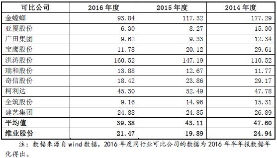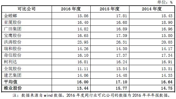 2013年至2016年,维业股份主营业务综合毛利率分别为13.88%、14.75%、15.77%、13.44%。维业股份主营业务毛利率略低于同行业可比上市公司的平均水平,2014年至2016年,同行业可比公司综合毛利率平均值分别为16.64%、17.10%、16.00%。