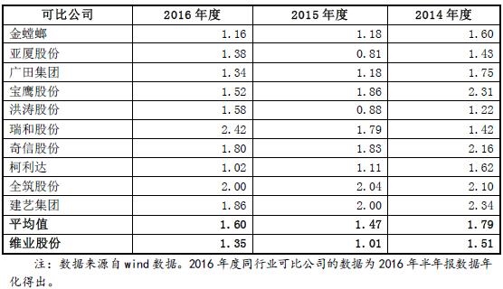 报告期内,维业股份的合并资产负债率分别为82.66%、76.23%和 72.07%,高于同行业上市公司。
