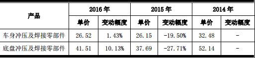 据招股书数据显示,常青股份主要产品车身冲压及焊接零部件单价大幅下降,2014年至2016年该产品单价分别为32.48元、26.15元、26.52元。