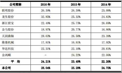 联明股份2014年至2016年毛利率分别为25.08%、26.39%、26.39%;龙生股份同期毛利率分别为24.62%、25.32%、32.85%;浙江世宝同期毛利率分别为26.69%、25.73%、22.49%;金马股份同期毛利率分别为16.86%、20.77%、18.97%;天润曲轴同期毛利率分别为23.39%、26.58%、28.63%;隆基机械同期毛利率分别为17.92%、16.81%、17.81%;华达科技同期毛利率分别为20.61%、22.10%、22.31%;金鸿顺2014年、2015年毛利率分别为22.95%、24.22%。