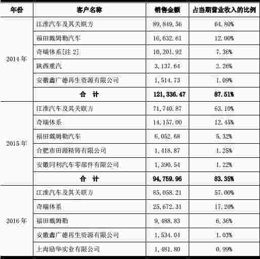 2014 年、2015 年和 2016 年,公司对前五名客户的销售额占当期营业收入的比例分别为 87.51%、83.35%和 82.58%,客户集中度较高,其中公司向江淮汽车及其关联方合计实现的销售收入占公司当期营业收入的比重分别为 64.80%、63.10%和 57.00%,公司对江淮汽车存在较大的依赖。