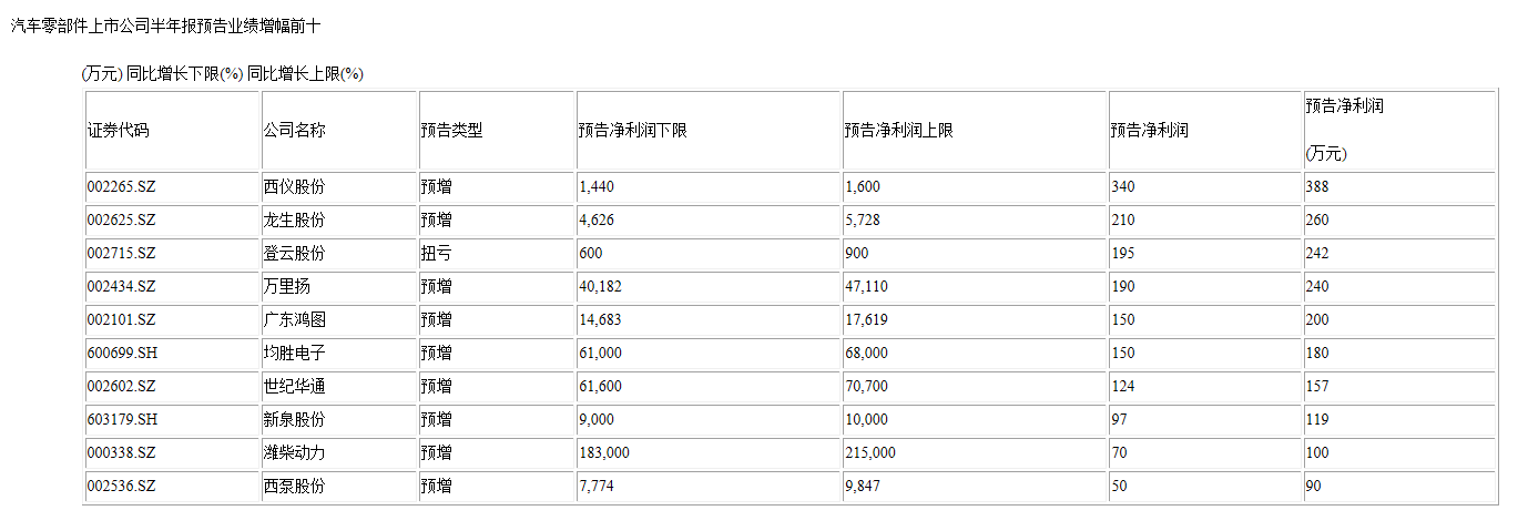 在已预告上半年业绩的上市公司中,汽车零部件公司成为表现最为突出的群体之一。统计数据显示,目前已有39家汽车零部件公司发布上半年业绩预告(含一季报中披露的),28家预喜,占比超过七成,其中净利润同比增幅上限预计超过50%的有15家,西仪股份、万里扬、广东鸿图、均胜电子等9家公司的净利润同比增幅上限更是预计超过100%。